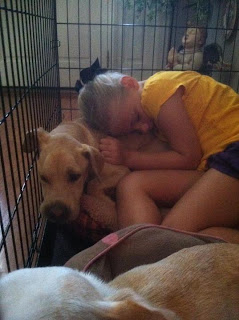 The kids have two dogs: Marley and Libby. They stay in a large crate when they visit us because Linzie isn't too social. Ann got in the crate Saturday and fell asleep against Marley.